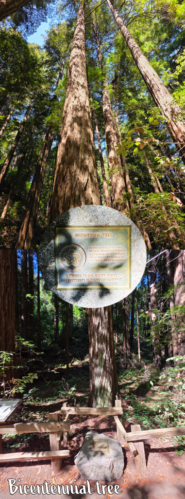 There are a few spots along the Hillside trail and other walking paths where you can get a picture inside a redwood, but this was the one that was least busy – at some there were queues of groups waiting for pictures. It was also very close to the Bicentennial tree, which – as it is likely impossible to read the sign – was commemorated in 1976 as having begun its life 200 years before. ‘As this redwood tree began its life, across the continent, a revolution occurred which transformed 13 colonies into the United States of America’.