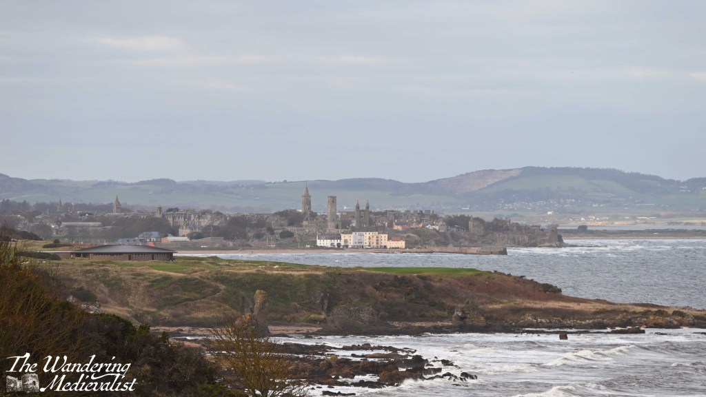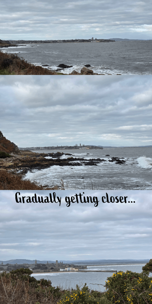 The path here becomes the more standard grassy path, and as I approached St Andrews I started to doubt whether the predicted sunshine would overcome what seemed to be pretty steady clouds. The overcast sky did not prevent me from taking plenty of different views of the town as I approached, of course – here are a few. Do I have sunny versions of these? Almost certainly. But there is something about this view of town that is impossible to resist.