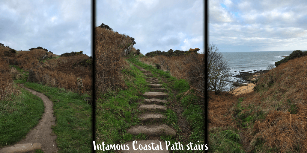 After ambling along at a good pace, enjoying being at the water level and the crashing waves, I realised that the cove I was in was quickly reaching its end, and there ahead of me was one of the Fife Coastal Path’s infamous – in my mind – stone staircases. The steps themselves are generally flat-ish rocks that have been layered into the hillside, and often wind back and forth as they climb steadily upwards. This is one of the longer sets that I have come across, and it definitely tested my endurance, which has declined since the summer. The view is of course excellent particularly if you have to stop and catch your breath.