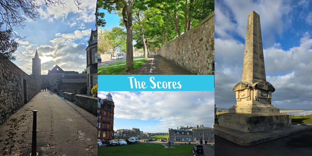 Avoid the temptation to turn right down the steps toward the Aquarium, and while there is no clear signage continue straight towards the towering Martyrs’ Monument, which was put in place to commemorate those killed during the Reformation. Beyond the Monument is the Royal and Ancient Golf Club of St Andrews and the famous Old Course. To the left, the buildings of the Scores including what used to be the Scores Hotel but is now Seton House, and the towering red Hamilton Grand, that incredible framing building to all pictures of the 18th hole. When I was a student it was still student housing, though has in intervening years been re-build into luxury condos.
