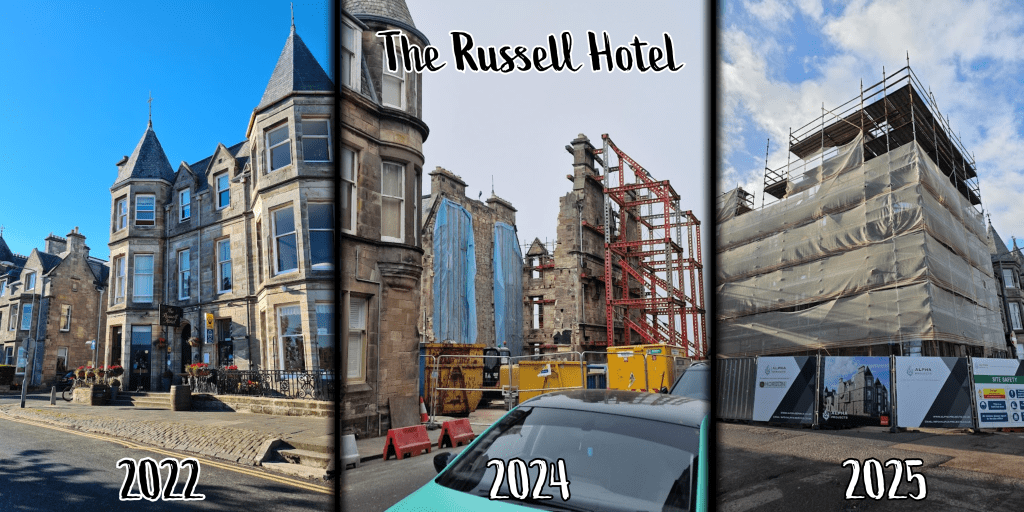 Continuing along the Scores, you will pass the Catholic Church, and ahead on the corner of Murray Park is what used to be the Russell Hotel, which was one of our favourite spots in town for excellent Scottish food. The couple who owned it eventually retired and the majority of the structure was torn down, so that all that remained was the listed frontispiece. As of writing, it is enshrouded in scaffolding and being rebuilt into what I understand will be flats.