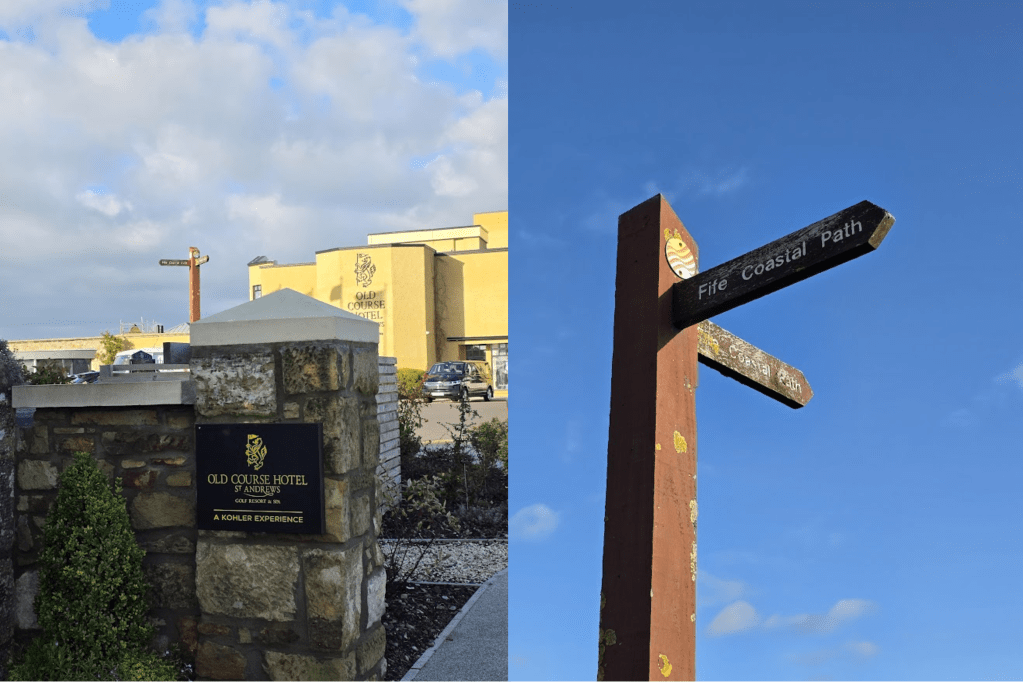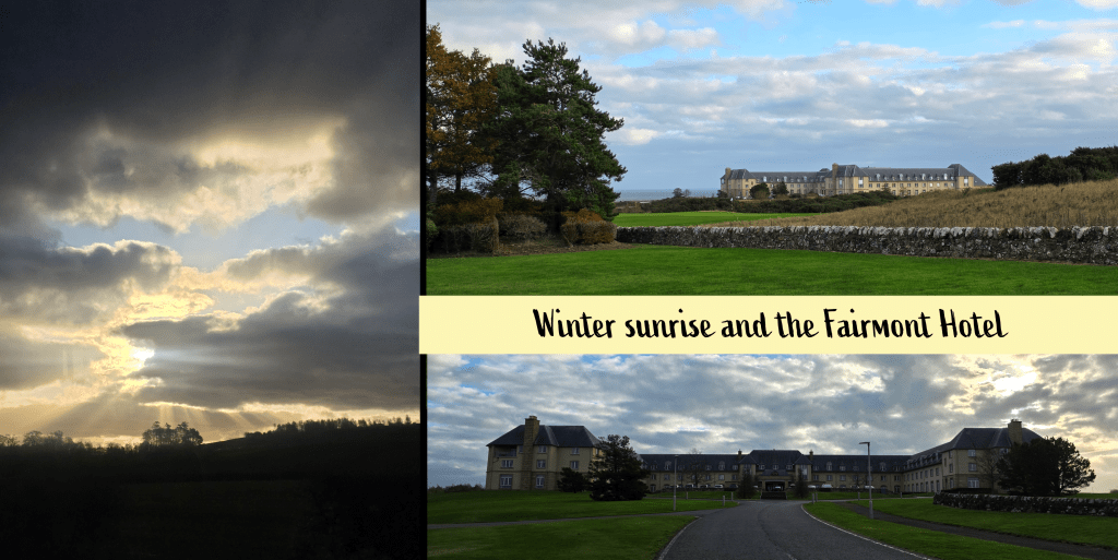 As would be expected in November, the morning was cool (8℃/46℉) with a cold wind and mostly cloudy with patches of blue sky. I wore my raincoat mostly as a windbreaker but also to guarantee against any stray rain showers – fortunately only needed for the wind. The bus trip was a short one – about 10 minutes – on the trusty 95 from St Andrews, and the stop is right on the road outside the entrance to the Fairmont estate. Fortunately there is a well-kept path running from the bus stop and along the access road up to the hotel. It is a gentle decline, allowing for a view over the North Sea as well as up to the hotel building, across the golf course.