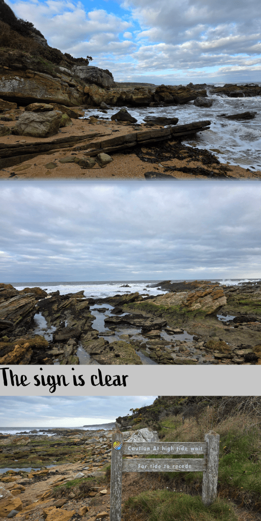 Specifically, it lay right about here, where the waves stretched inland along a rocky edge, threatening to very quickly cut me off from the path ahead. Like many of these small beaches, this cove was backed by a rock cliff and, as the sign clearly told me, if the tide was too high I would have no choice but to wait – there was no high tide route.