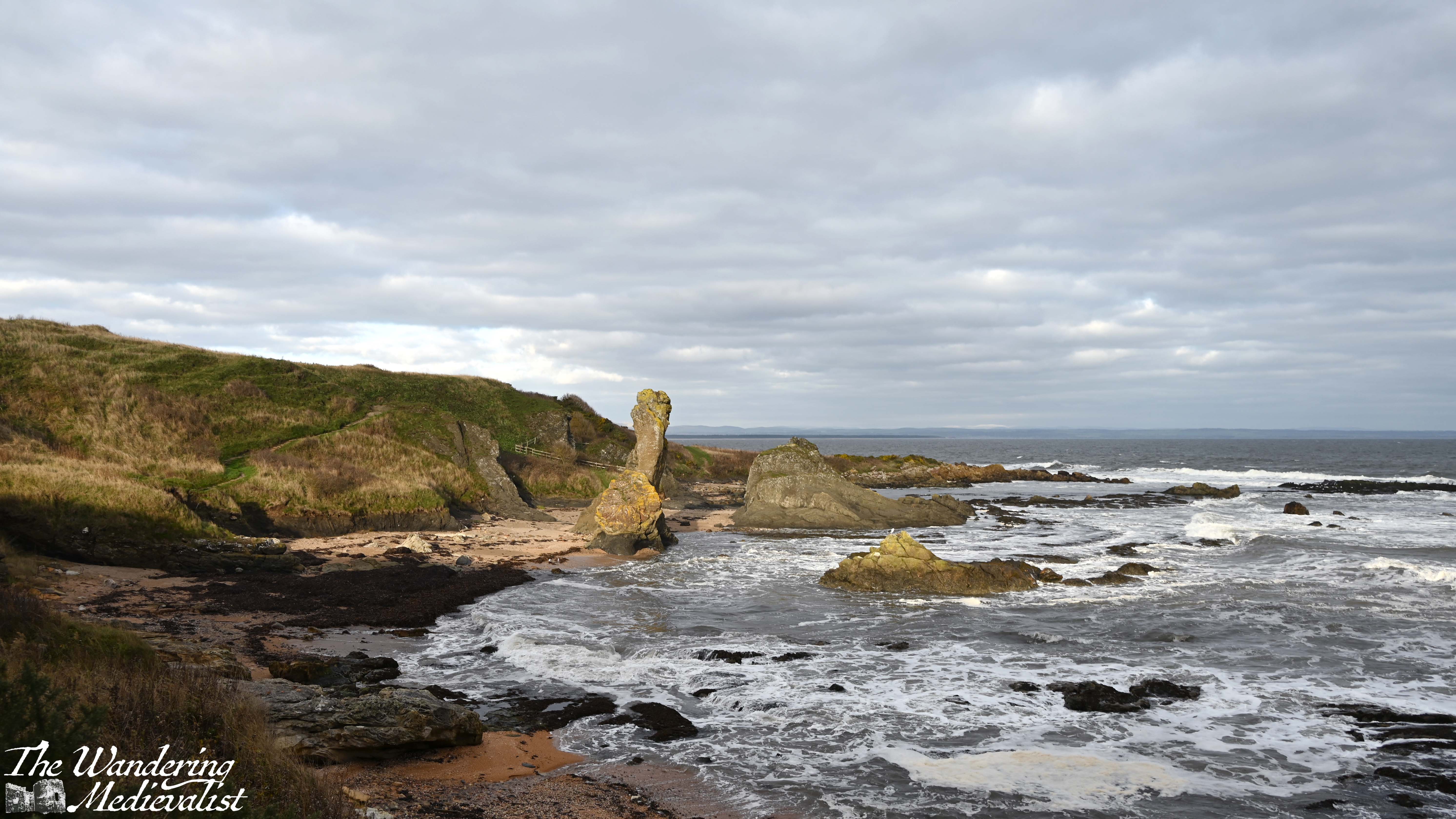 There is also, I should note, a route above the rock formation which offers great views across the golf course and of the Castle Course clubhouse; Dad and I took this path when we walked out here many years ago (and of course I cannot find those pictures for reference). Alternatively, walkers can get down to the beach here to get closer to the rocks, but I was ready to make some progress and so passed through a wonky gate and continued on my way.