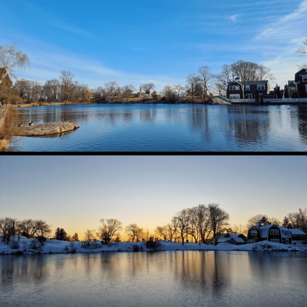 More Redd’s Pond, but how could I resist? One in late winter, the other in mid-winter at sunrise, on a magical morning that a wrote a whole post about. The reflections here are hazy rather than crisp, but equally lovely.