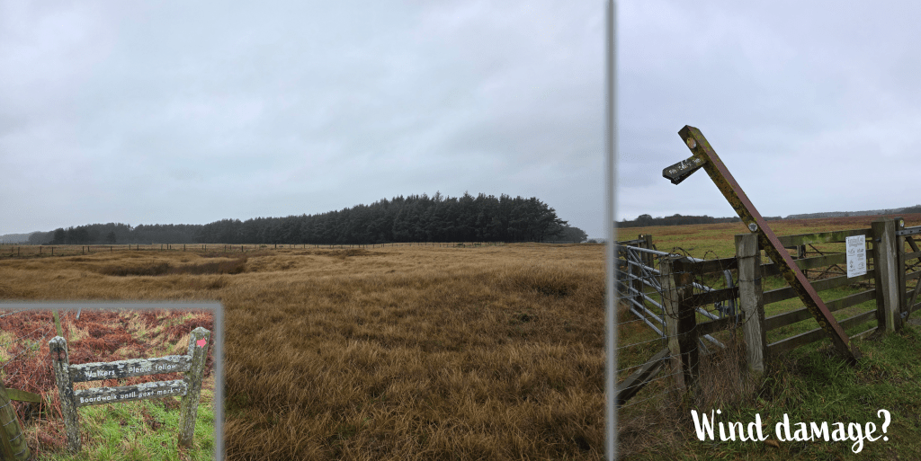 Just under a mile after leaving the castle, I reached the gate where, on my last attempt, I had been forced to take a detour. Fortunately, this time I knew I would be able to take the standard path, as I had seen the update on Facebook that the boardwalk was fully repaired. The sign directing walkers had suffered a bit of wind damage, but the path was clear nonetheless. I passed through two sets of gates and struck out across the field between two fences; the trail rises and falls over hillocks and grass clumps, much more uneven than the farm track.