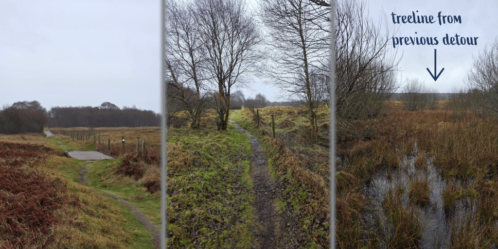 The path alternates on boardwalk sections and uneven muddy ground, following the edge of a fence and meandering through stands of trees. The direct path made me appreciate just how long the detour was that I took last year – the tree line of the forest I walked through is a good half mile or so away.