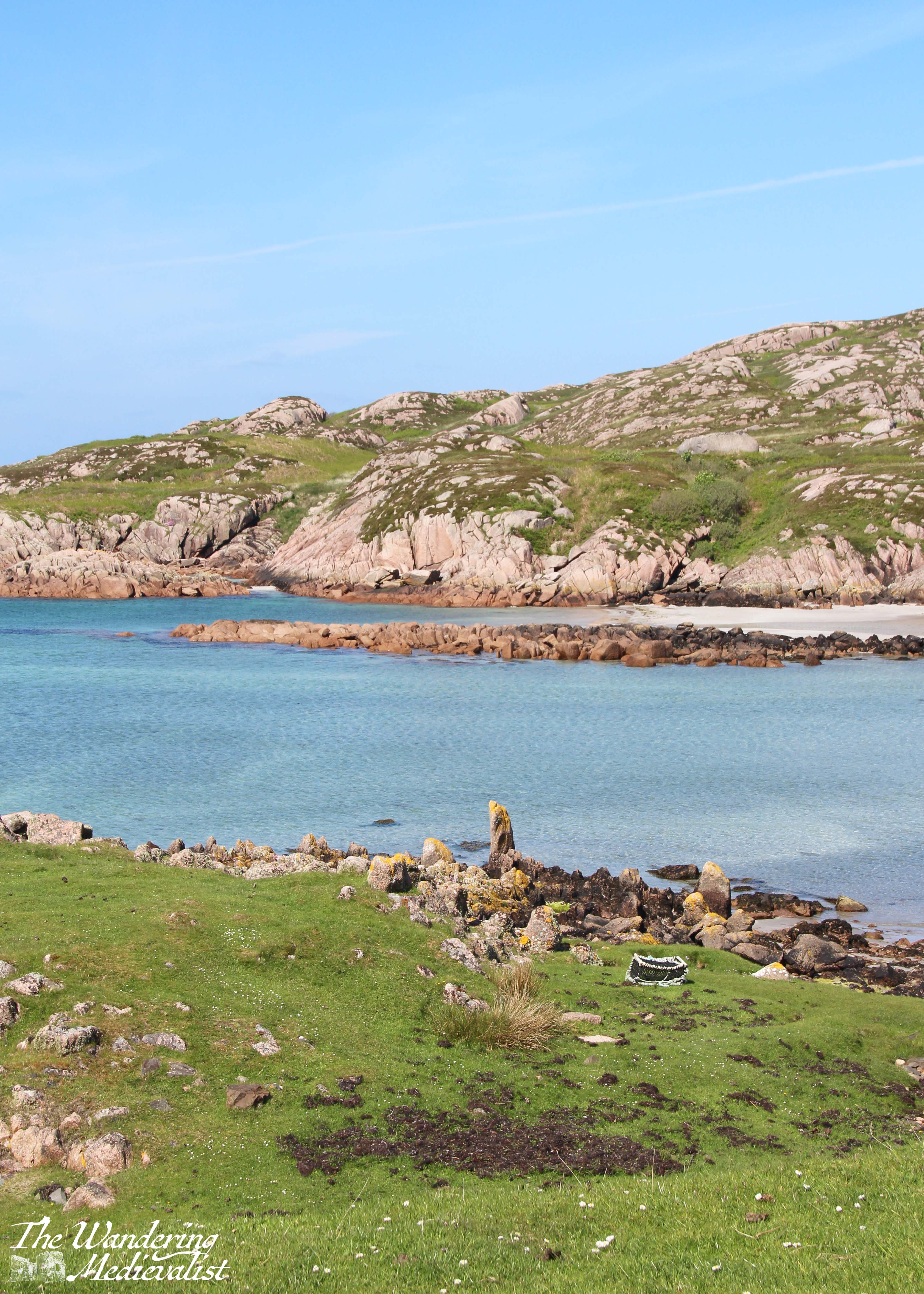 This café offers snacks, coffee and, most importantly, a gorgeous view of the beach and the Sound of Iona. As we had arrived about 20 minutes before the next ferry would start to load, and our tickets were bought well in advance and safe on my phone, we made ourselves comfortable and I found myself entranced by the beach and rocks around it, to which greenery clings where it can.