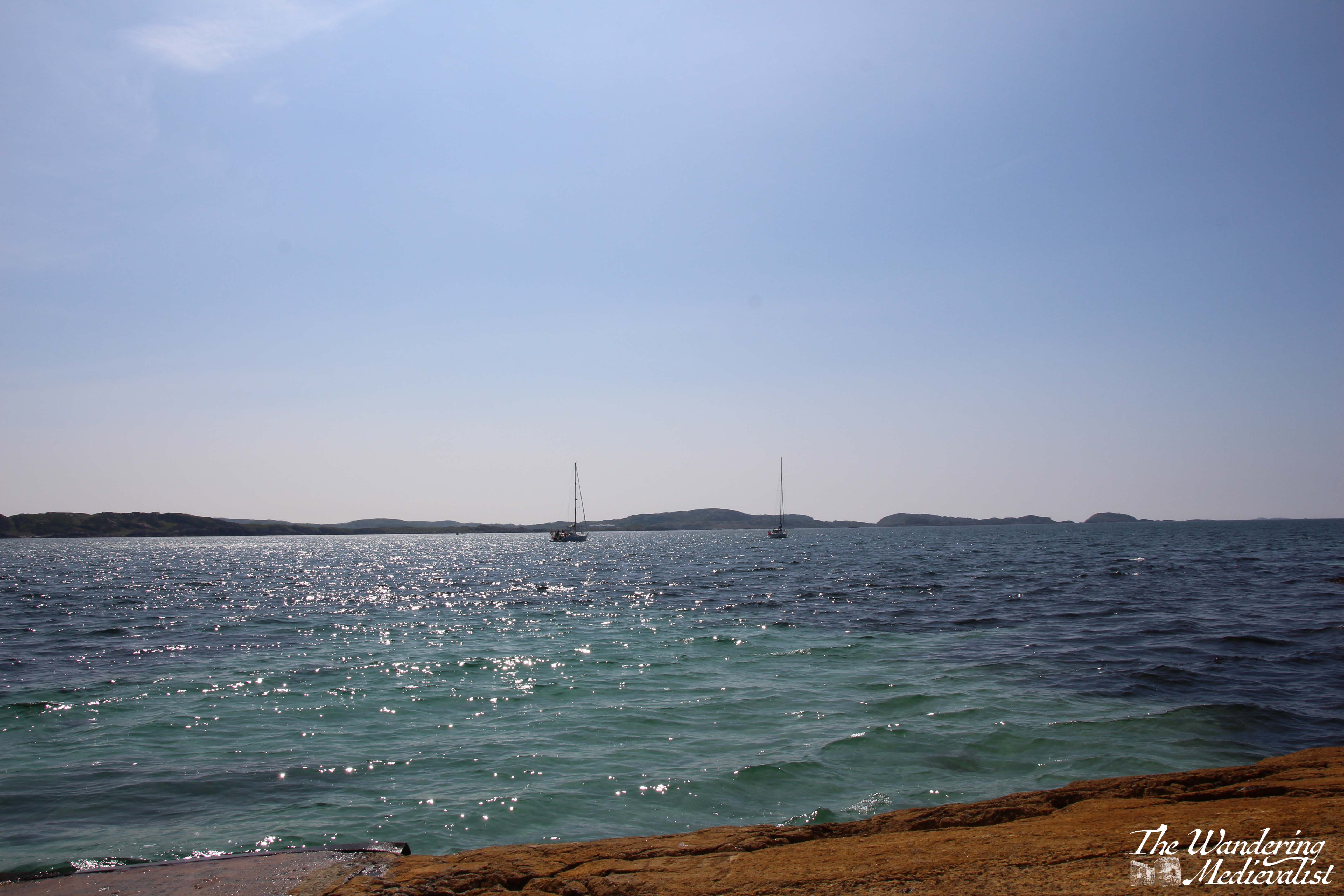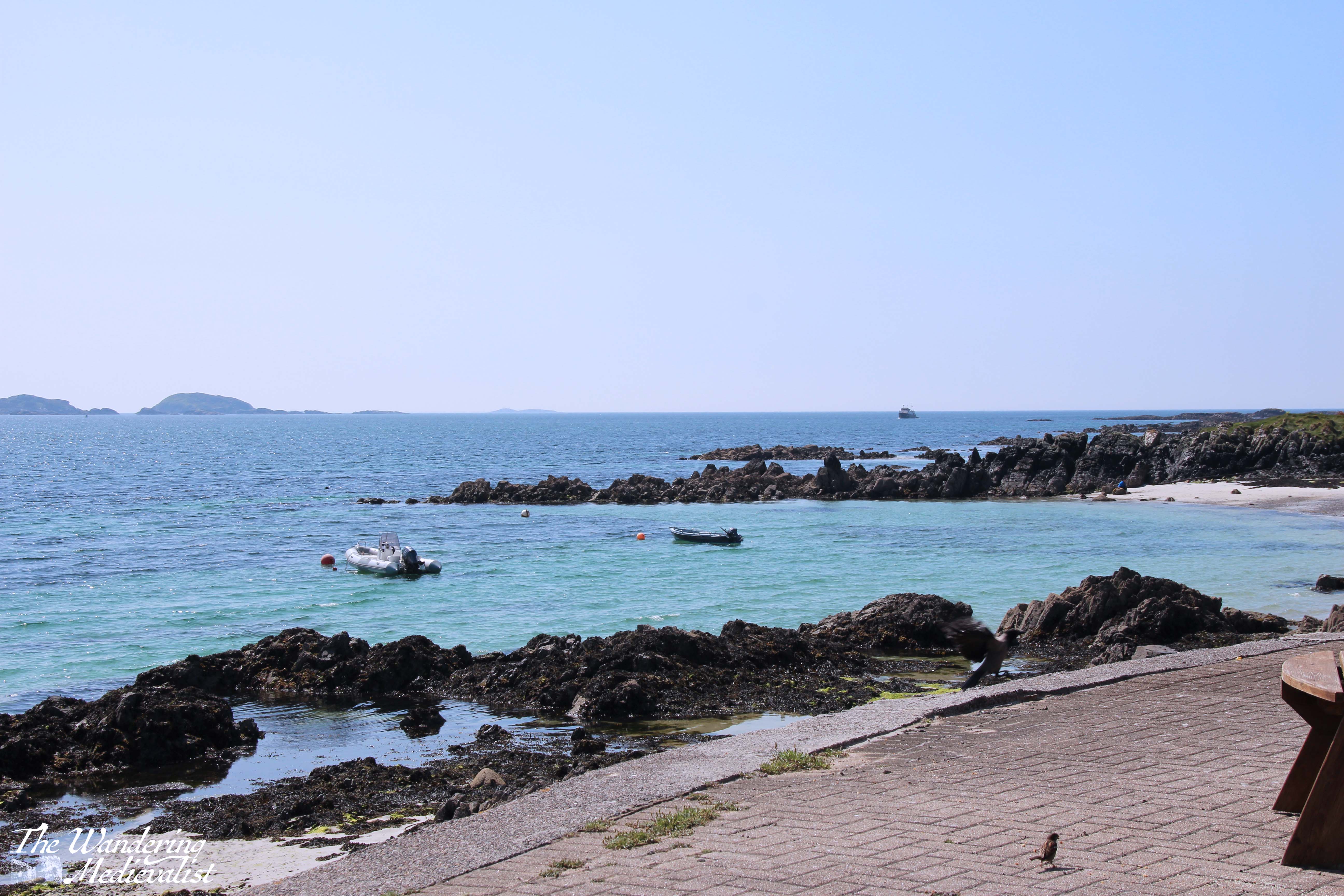 We had spent so much time and energy that morning rushing to get from Oban to Mull to Iona that once we finally set foot on the island, we decided it was most important to find some lunch and perhaps another cup of coffee (always paramount on our travels). Fortunately, the Martyr’s Bay Restaurant was just what we wanted: only steps from the ferry and providing an excellent array of drinks, snacks, sandwiches and of course home baking. They also sell Iona whisky and gin, as well as numerous other souvenirs. We took our lunch outside to sit in the sun and enjoy the view over the Sound. Side note, I had remembered to slather myself with suntan lotion that morning, much to my later relief. Anyone who says sunscreen is not required in Scotland is…well…just wrong.