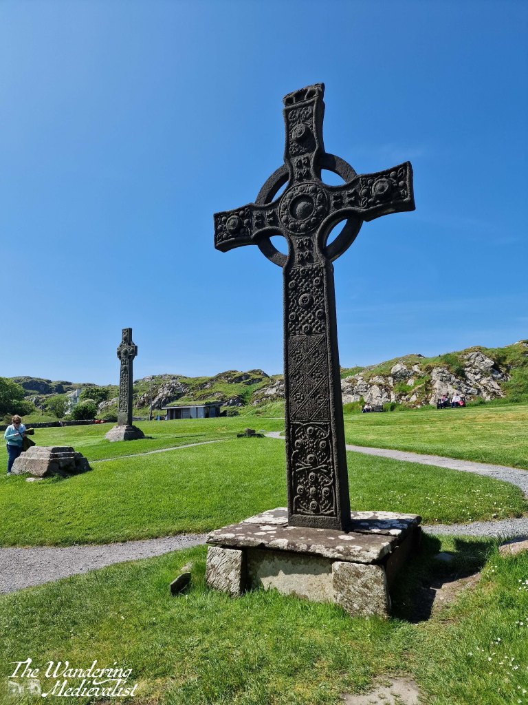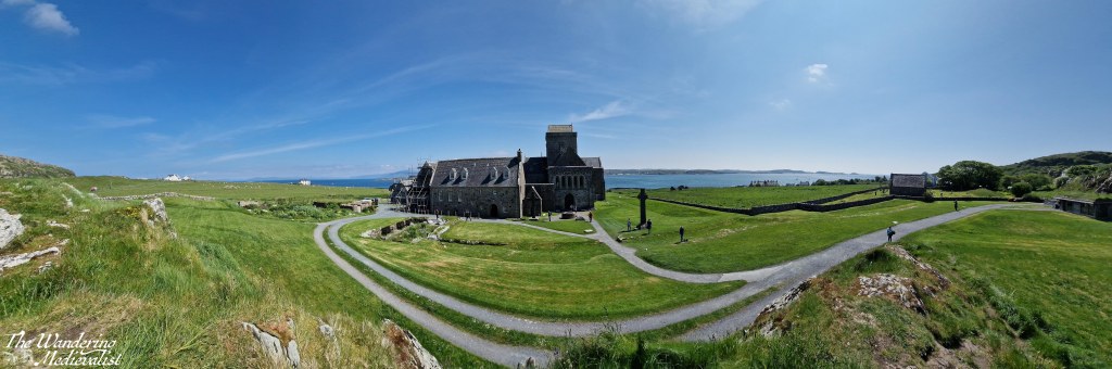 Almost immediately upon entering the abbey grounds, we found plaques with information telling us about the road we were on and much more. To the left, the Tòrr an aba, ‘hill of the abbot’ was irresistible to climb, and I found that it did indeed offer excellent views over the abbey complex, the Sound, and the island. The hill may well have been the site of St Columba’s writing hut. Again, there is more of the view in the video below.