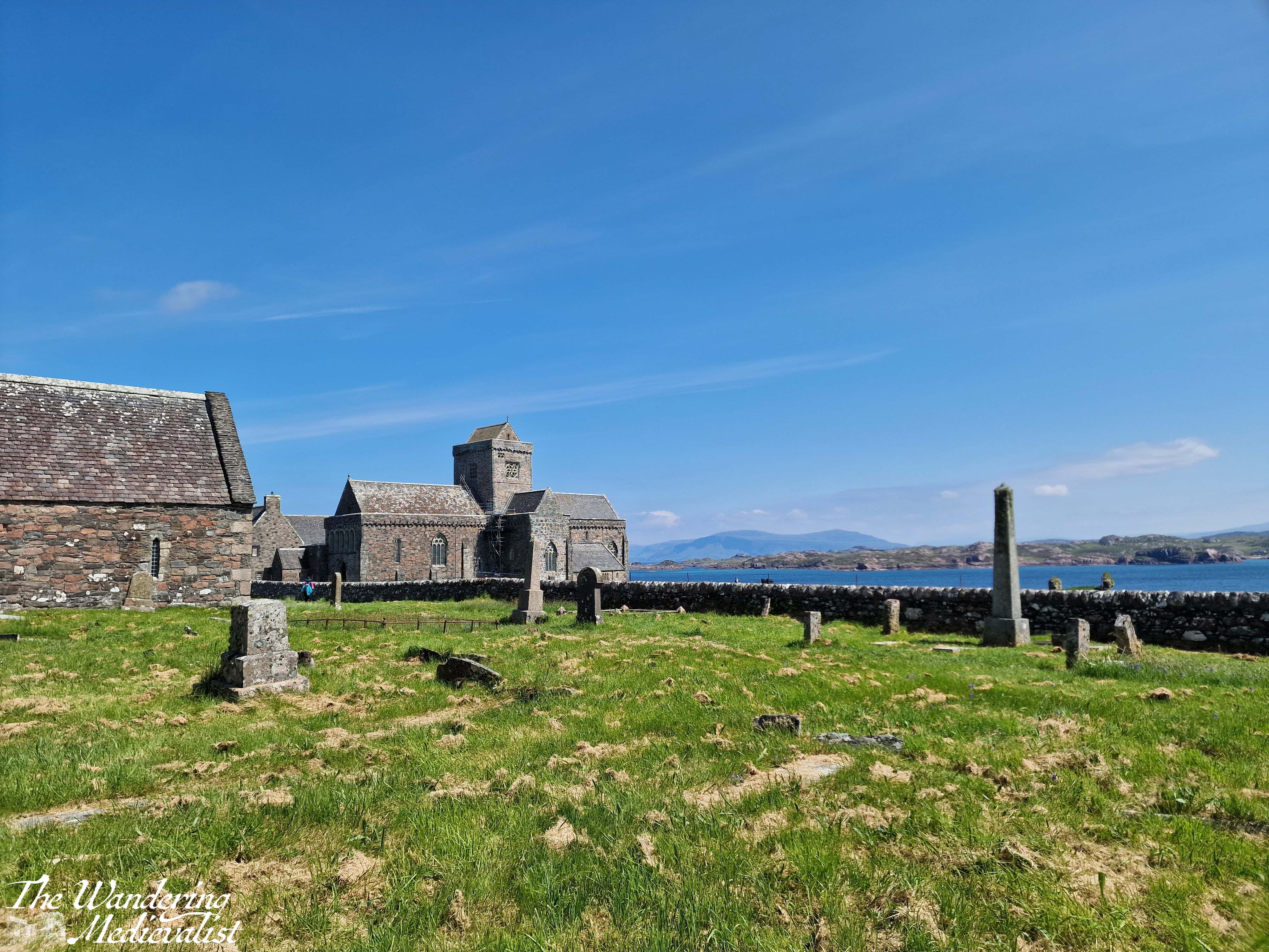 The first break in the wall to the right allows entrance to the Reilig Odhrain, the land consecrated as a monastic burial ground from the time of St Columba. The burial ground is free to enter, and does allow views of the abbey from a distance, as well as a wander through burial markers both old and quite new.